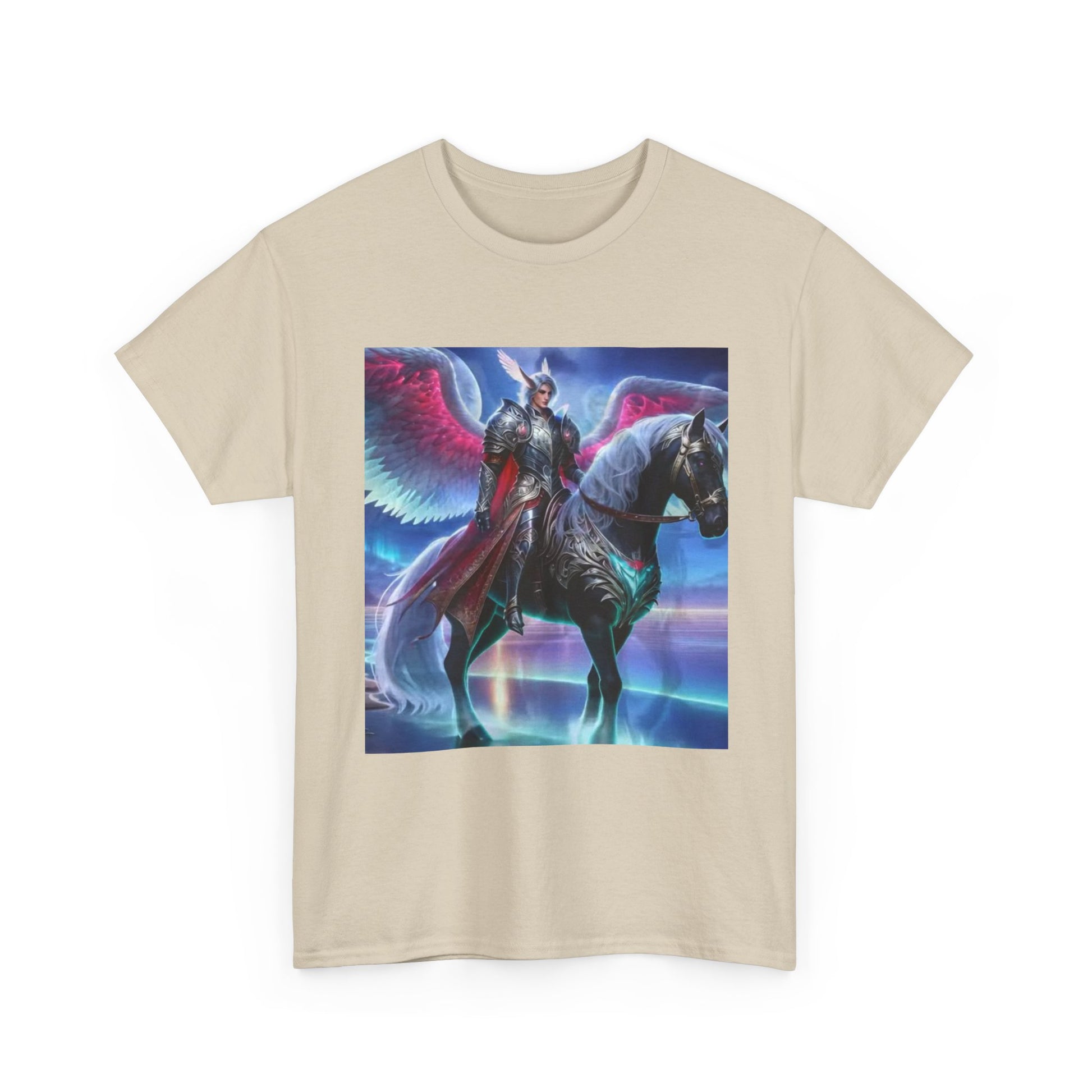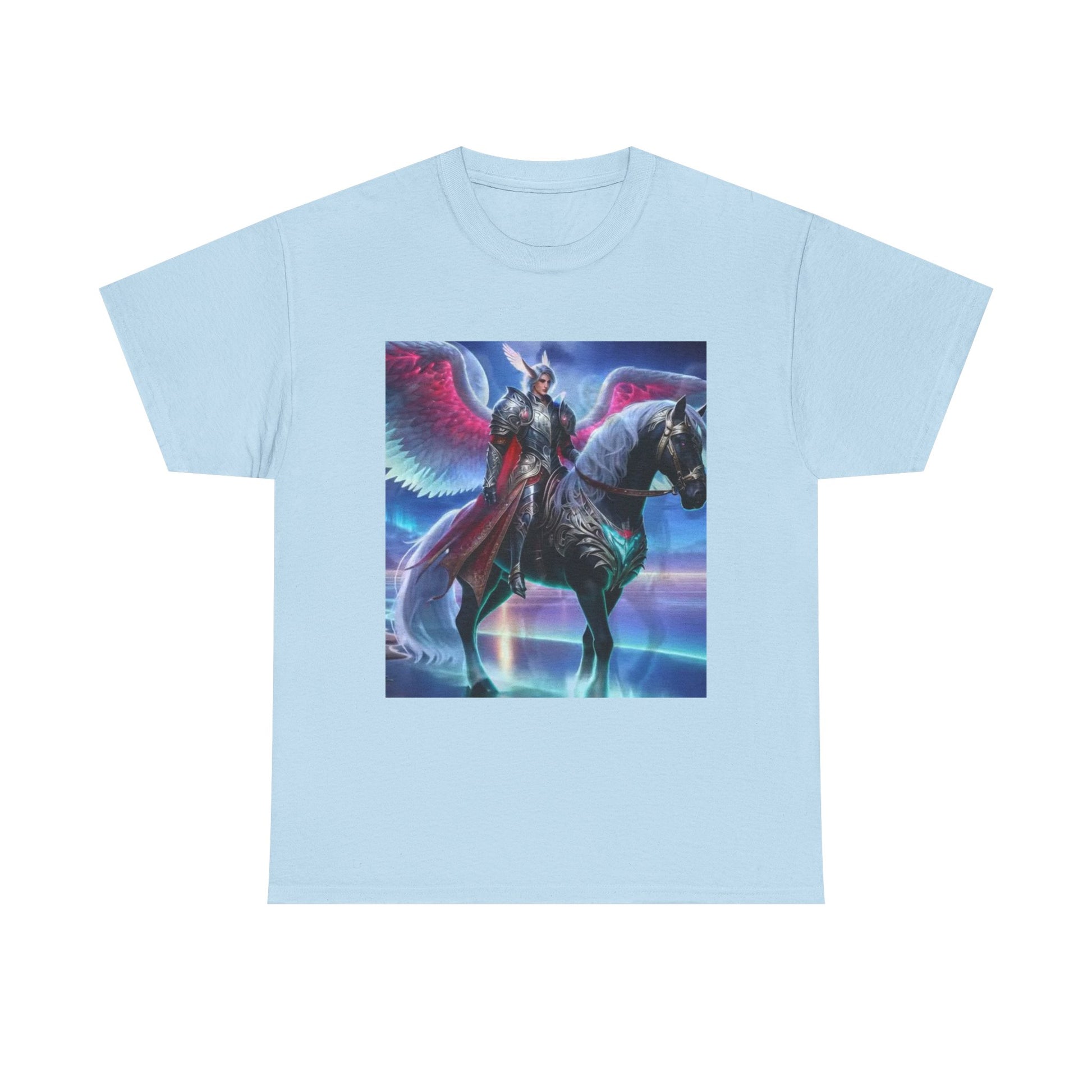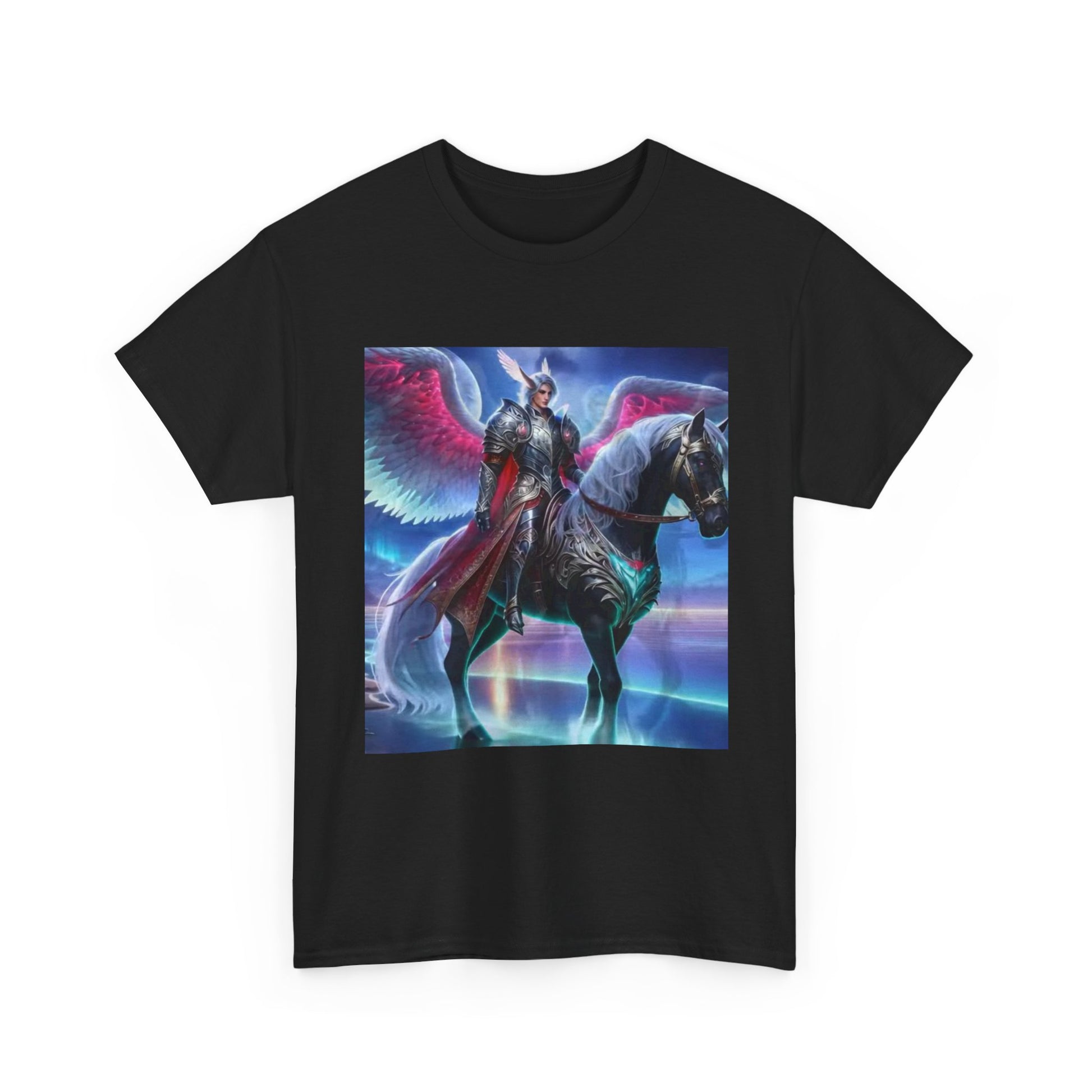 Ride into the unknown with unwavering purpose in the Celestial Rider Tee. Featuring a divine warrior with radiant wings astride a noble steed, this design evokes the majesty of cosmic journeys and the strength of a soul guided by light. Set against a glowing horizon of stars and mystery, itโs a powerful tribute to those who walk between realmsโfearless, faithful, and forever in motion.