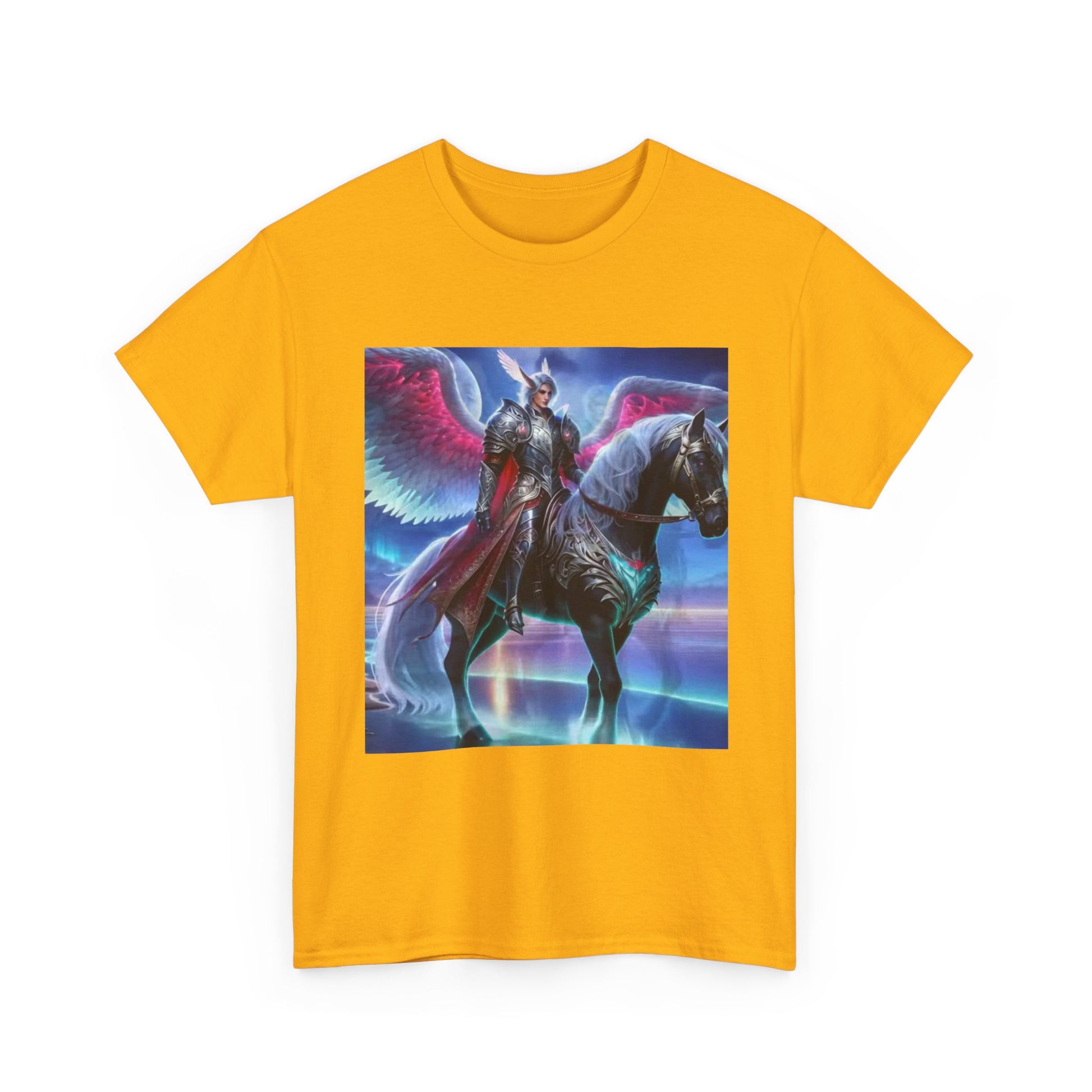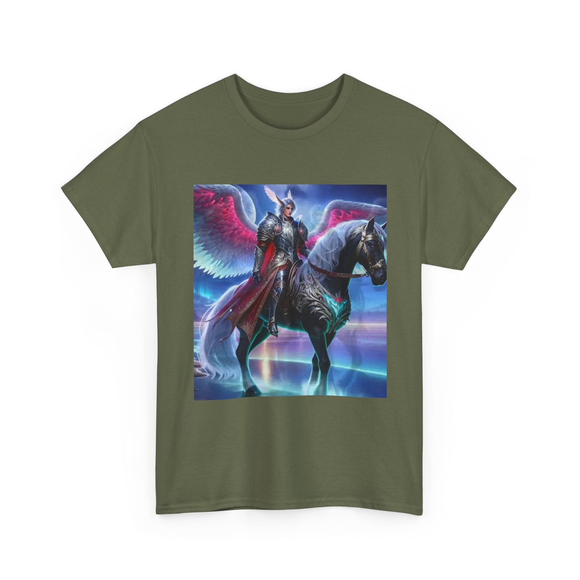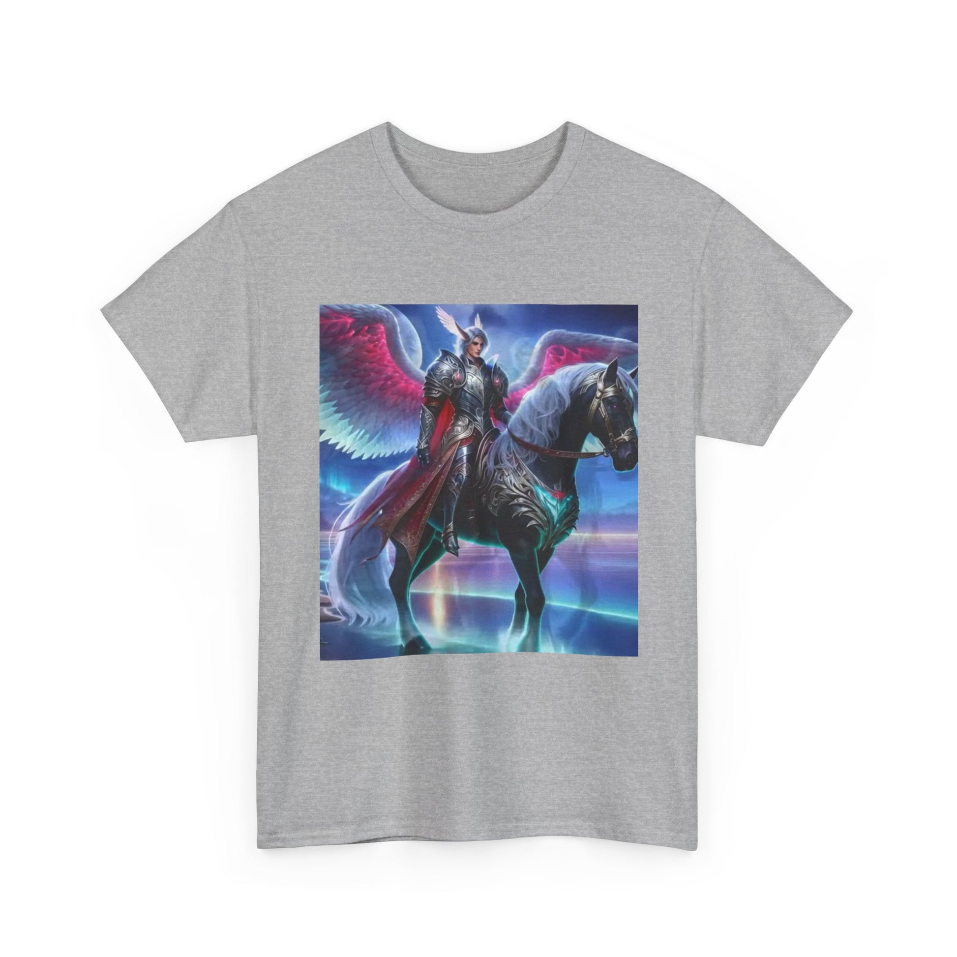 Ride into the unknown with unwavering purpose in the Celestial Rider Tee. Featuring a divine warrior with radiant wings astride a noble steed, this design evokes the majesty of cosmic journeys and the strength of a soul guided by light. Set against a glowing horizon of stars and mystery, itโs a powerful tribute to those who walk between realmsโfearless, faithful, and forever in motion.